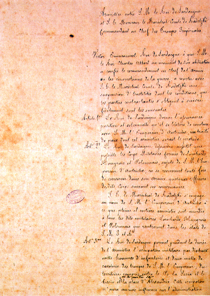 Questo documento sancisce la fine della prima guerra d’Indipendenza, iniziata nel marzo 1848 con l’intervento piemontese in Lombardia.