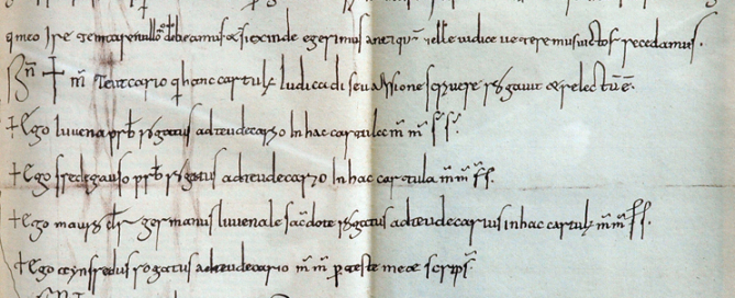 Aprile 810 Teutcario Alamanno fa donazione all’abbazia della Novalesa di quanto possiede in Cumiana, in case, edifizi e terre, da Montegrosso fino alla pietra dei Bicciati, per salute dell’anima sua e di Riccarda sua moglie Questa pergamena offre l’esempio di un atto di giurisdizione privata. Dal punto di vista paleografico, questo documento è notevole per la [...]