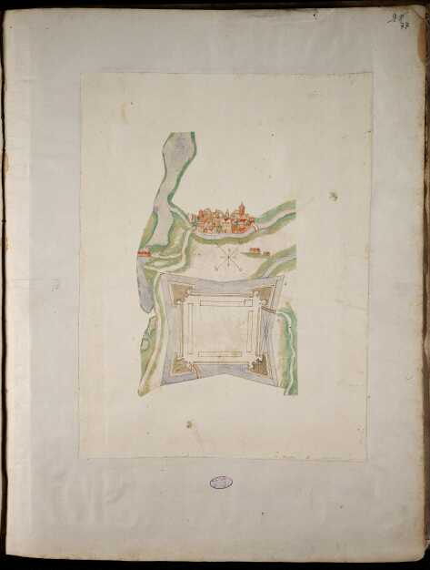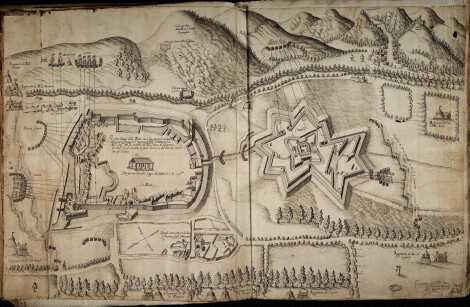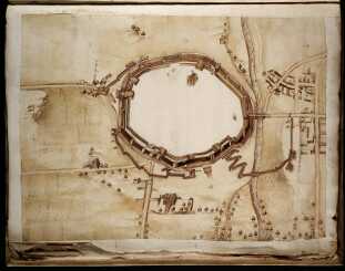 Luogo non identificato. Carta topografica con una fortezza in pianta e dettagli in prospettiva