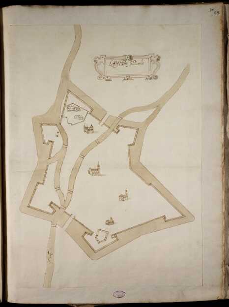 La Fère. Pianta delle mura, fortificazioni e ponti con edifici religiosi in prospettiva