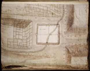 Luogo non identificato. Pianta con dettagli in prospettiva di cittadella fortificata