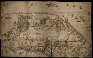 La Rochelle. Pianta delle mura e fortificazioni con edifici in prospettiva durante un assedio