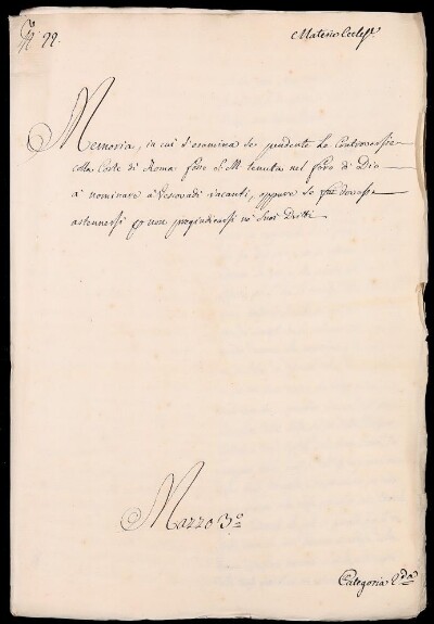 Memoria in cui s'esamina se pendente le Controversie colla Corte di Roma fosse S. M. tenuta nel foro di Dio a nominare a Vescovadi Vacanti oppure se dovesse astenersi per non pregiudicarsi ne' suoi dritti