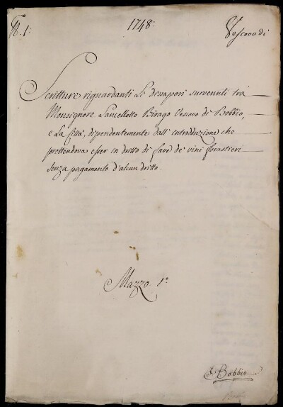 Scritture riguardanti li dissapori survenuti tra Monsig.re Lancellotto Birago Vescovo di Bobbio, e La Città, dipendentemente dall'introdduzione, che pretendeva esser in dritto di fare de' Vini Forastieri senza pagamento d'alcun Dritto 1748