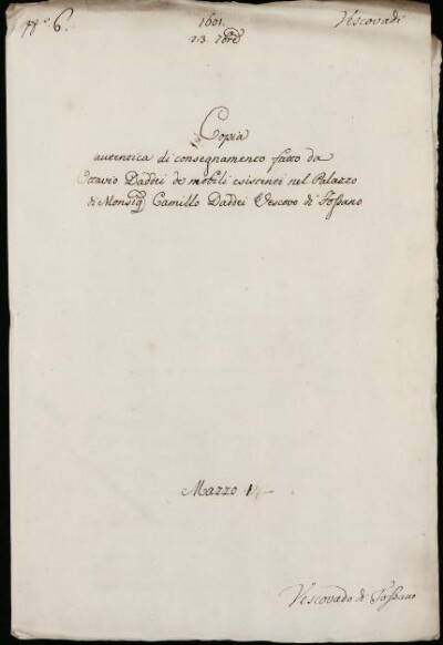Consignamento fatto da Ottavio Daddei de' mobili esistenti nel Palazzo di Monsig.r Cammillo Daddei Vescovo di Fossano 23. 7bre 1601