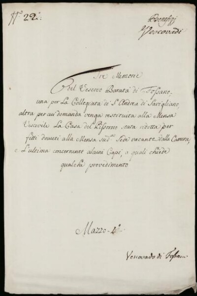 Tre Memorie del Vescovo Baratà di Fossano; una per La Collegiata di S.t'Andrea di Savigliano; Altra per cui domanda venga restituita alla Mensa Vescovile la Casa del Pivorno, stata ridotta per fitti dovuti alla Mensa sud.a, Sede Vacante, dalla Camera; e L'ultima concernente alcuni Capi, a quali chiede qualche provedimento