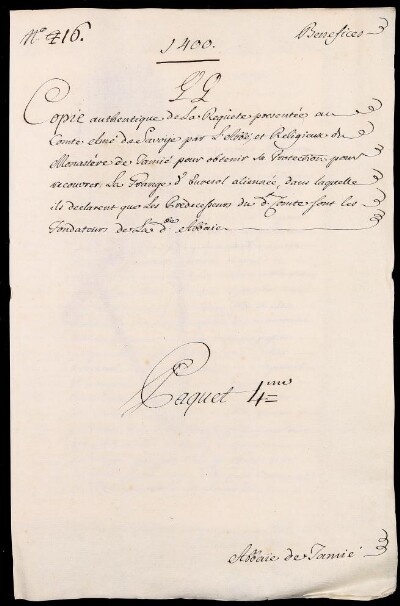 Sei in Strumenti di ricerca: Sezione Corte | Scritture riguardanti li regolari tanto di qua che di là da' monti in Materie ecclesiastiche [Inventario n. 87] | Regolari di là dai monti | Mazzo 4 | Fascicolo 16. Citeaux de Tamié. Abbaie de Notre Dame
