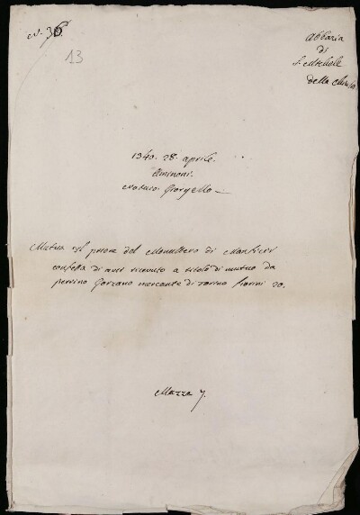 Mutuo. Il priore del monastero di Monticèv confessa di aver ricevuto a titolo di mutuo da Perrino Gozzano mercante di Torino fiorini 20. 1340, apr. 28 - notaio Giorgello.