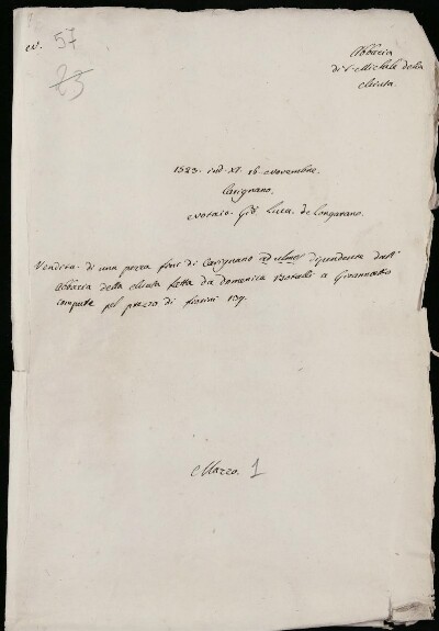 Vendita di una pezza fini di Carignano ad ulmos dipendente dall'abbazia della Chiusa fatta da Domenica Botalli a Gioannetto Compate pel prezzo di fiorini 139. 1523, ind. XI - notaio Gio. Luca de Longariagno; già n. 23