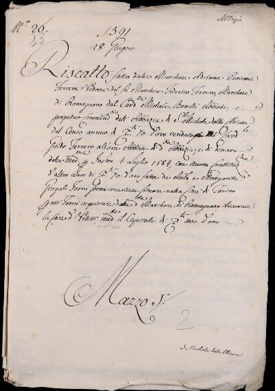 Riscatto fatto dalla marchesa Adriana Provana Ferrera vedova del fu marchese Federico Ferrero, marchese di Romagnano dal cardinale Michele Bonelli abbate e perpetuo commandatario dell'abbazia di S. Michele della Chiusa del censo annuo di scudi 70 d'oro venduto dal cardinale Guido Ferrero allora abbate di detta abbazia, e di denaro della medesima per instrumento 4 luglio 1584, con nuova constituzione d'altro censo di scudi 70 d'oro fatta da Antonio e Morgante giugali Forni sovra una casa situata nella città di Torino per essi Forni acquistata dalla detta marchesa di Romagnano chiamata la casa di Otissi, mediante il capitale di scudi 1000 d'oro.