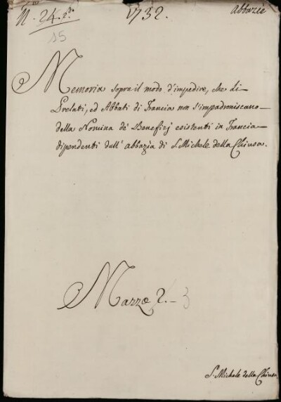 Memoria sopra il modo d'impedire che li prelati ed abbati di Francia non s'impadroniscano della nomina de' benefizi esistenti in Francia dipendenti dall'abbazia di S. Michele della Chiusa. 1732 - già n. 24