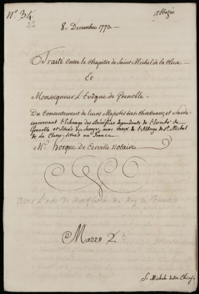 Traité entre le chapitre de S. Michel de la Cluse et monseigneur l'eveque de Grenoble.Du conseutement de leurs majesté... chretienne et sarde concernant l'echange des bénéfices dependants de l'eveche de Grenoble et situés en Savoye, avec ceux de l'abbaye de S.t Michel de la Cluse situè en France.