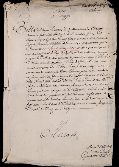 Bolla del papa Pio XXIII di confermazione de' privilegi concessi a favore dell'abbazia di S. Michele della Chiusa dalli papa Leone, Alessandro, Gregorio, Urbano, Pascale, Calisto, Innocenzo, Eugenio, Anastasio, Alessandro ed Innocenzo e spezialmente quello d'Innocenzo IV delli 26 febbraio 1245 ivi tenorizata, nella quale sono nominati tutti li benefizi dipendenti dalla collazione, nomina e visita di detto abate, con aggiunta de' privilegi..... 1414, mag. 25