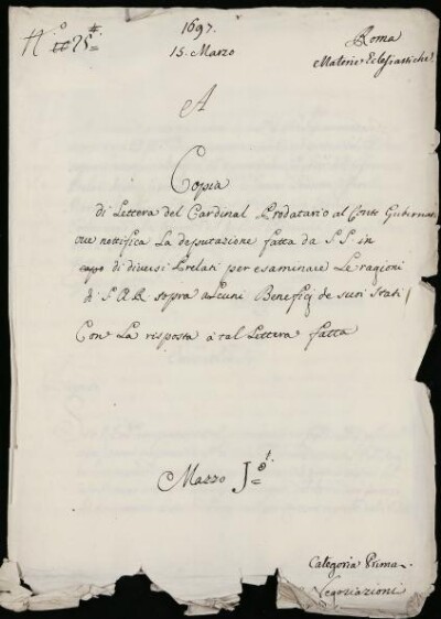 Sei in Strumenti di ricerca: Sezione Corte | Materie ecclesiastiche per categorie [Inventario n. 79.1] | Categoria 1. Negoziazione colla Corte di Roma | Mazzo 1 | Fascicolo 25
