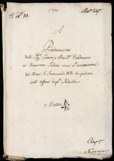 Sei in Strumenti di ricerca: Sezione Corte | Materie ecclesiastiche per categorie [Inventario n. 79.1] | Categoria 1. Negoziazione colla Corte di Roma | Mazzo 4 | Fascicolo 10
