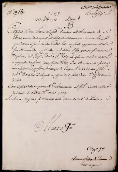 Copia di due lettere del Cardinale Paolucci all'Arcivescovo di Torino, in una delle quali gli chiede de' chiarimenti sovra la giurisdiz.ne esercitata dai Giudici Laici ne' Feudi appartenenti al suo Arcivescovo, e nell'Altra gli chiede il suo parere sovra un Diploma dell'Imperatore Federico Primo, del quale gliene manda copia a riguardo de' Castelli della Chiesa d'Asti, e dei chiarimenti s.a una Sentenza proferta in tempo di Papa Pio V. da un Cardinale dal d.o Pontefice Delegato a riguardo de' Feudi della d.a Chiesa d'Asti. 23. 9.bre e 23. X.bre 1709.