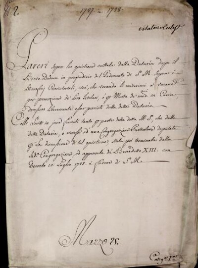 Pareri sopra la questione eccitata dalla Dataria dopo il Breve Dudum in pregiudizio del Padronato di S. M. sopra i Benefizj concistoriali, cioé che venendo li Medesimi a vacare per promozione de loro Titolari, o per morte de medesimi in Curia dovessero liberamente esser provisti dalla d.a Dataria. Colli Scritti in jure formati tanto per parte della d.a M. S. che dalla detta Dataria, e rimessi ad una congregazione particolare deputata per la discussione di tal quistione stata poi terminata dalla sud.a Congregazione, ed approvata da Benedetto XIII. con decreto 10. luglio 1728. a favore di S. M. 1727. in 1728