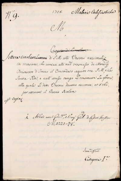 Sei in Strumenti di ricerca: Sezione Corte | Materie ecclesiastiche per categorie [Inventario n. 79.1] | Categoria 1. Negoziazione colla Corte di Roma | Mazzo 28 | Fascicolo 9