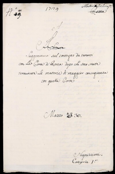 Sei in Strumenti di ricerca: Sezione Corte | Materie ecclesiastiche per categorie [Inventario n. 79.1] | Categoria 1. Negoziazione colla Corte di Roma | Mazzo 30 | Fascicolo 9