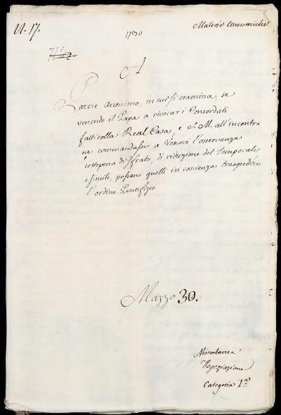 Sei in Strumenti di ricerca: Sezione Corte | Materie ecclesiastiche per categorie [Inventario n. 79.1] | Categoria 1. Negoziazione colla Corte di Roma | Mazzo 30 | Fascicolo 17