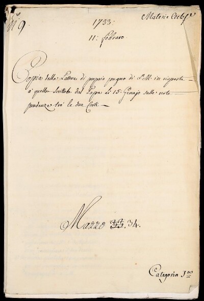 Sei in Strumenti di ricerca: Sezione Corte | Materie ecclesiastiche per categorie [Inventario n. 79.1] | Categoria 1. Negoziazione colla Corte di Roma | Mazzo 34 | Fascicolo 9