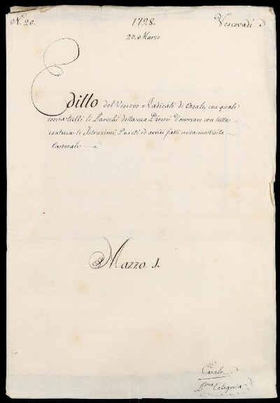 Sei in Strumenti di ricerca: Sezione Corte | Arcivescovadi e vescovadi in Materie ecclesiastiche [Inventario n. 80] | Vescovado di Casale. Classe prima | Mazzo 1 | Fascicolo 20