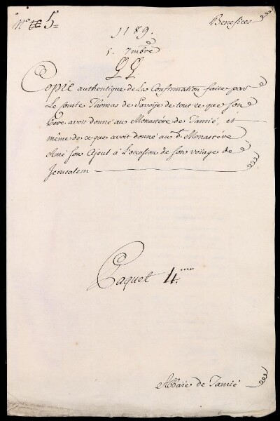 Sei in Strumenti di ricerca: Sezione Corte | Scritture riguardanti li regolari tanto di qua che di là da' monti in Materie ecclesiastiche [Inventario n. 87] | Regolari di là dai monti | Mazzo 4 | Fascicolo 5. Citeaux de Tamié. Abbaie de Notre Dame