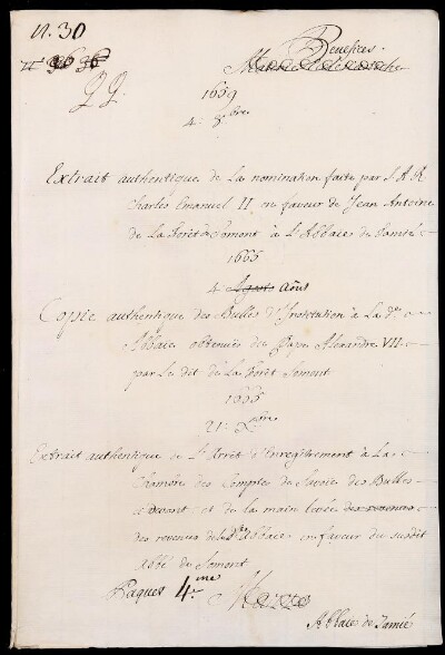 Sei in Strumenti di ricerca: Sezione Corte | Scritture riguardanti li regolari tanto di qua che di là da' monti in Materie ecclesiastiche [Inventario n. 87] | Regolari di là dai monti | Mazzo 4 | Fascicolo 30. Citeaux de Tamié. Abbaie de Notre Dame
