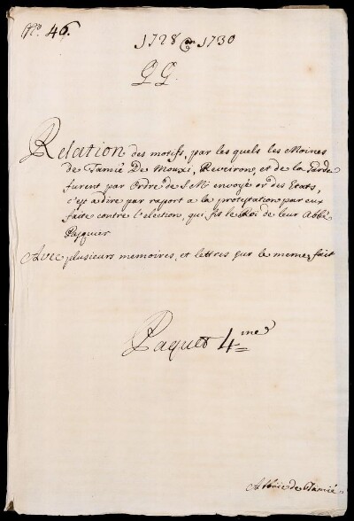 Sei in Strumenti di ricerca: Sezione Corte | Scritture riguardanti li regolari tanto di qua che di là da' monti in Materie ecclesiastiche [Inventario n. 87] | Regolari di là dai monti | Mazzo 4 | Fascicolo 46. Citeaux de Tamié. Abbaie de Notre Dame