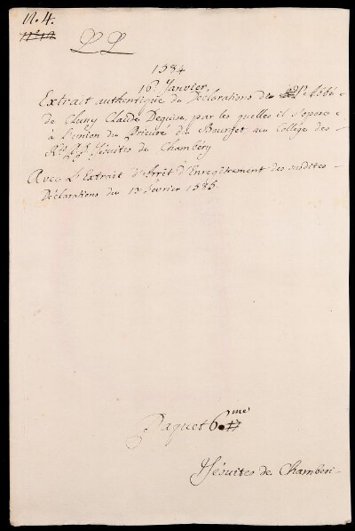 Sei in Strumenti di ricerca: Sezione Corte | Scritture riguardanti li regolari tanto di qua che di là da' monti in Materie ecclesiastiche [Inventario n. 87] | Regolari di là dai monti | Mazzo 6 | Fascicolo 4. Jesuites de Chambery
