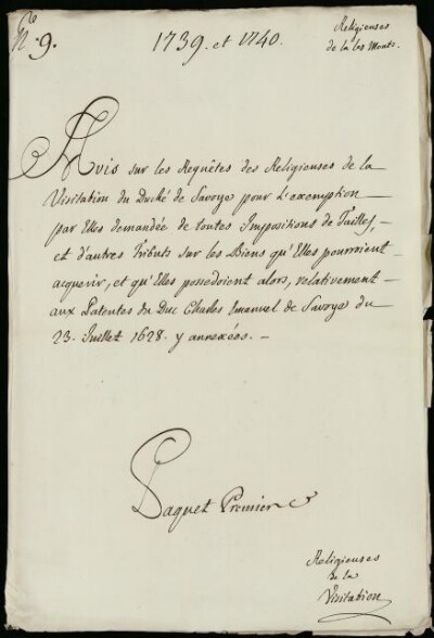 Sei in Strumenti di ricerca: Sezione Corte | Scritture riguardanti le monache tanto di qua che di là da' monti in Materie ecclesiastiche [Inventario n. 88] | Monache di là da'Monti | Mazzo 1 | Fascicolo 9. Annecÿ Religieuses de la Visitation