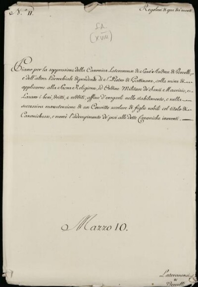 Sei in Strumenti di ricerca: Sezione Corte | Scritture riguardanti li regolari tanto di qua che di là da' monti in Materie ecclesiastiche [Inventario n. 87] | Regolari di quà dei monti | Mazzo 10 | Fascicolo 11. Lateranensi di Vercelli. Abbazia di S.t Andrea