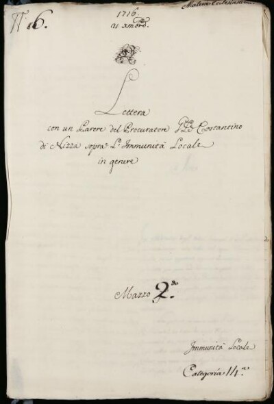Sei in Strumenti di ricerca: Sezione Corte | Materie ecclesiastiche per categorie [Inventario n. 79.2] | Categoria 14. Immunità locale | Mazzo 2 | Fascicolo 6