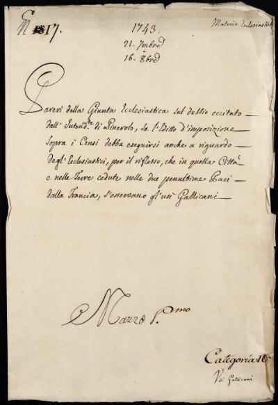 Sei in Strumenti di ricerca: Sezione Corte | Materie ecclesiastiche per categorie [Inventario n. 79.2] | Categoria 16. Usi Gallicani | Mazzo 1 | Fascicolo 17