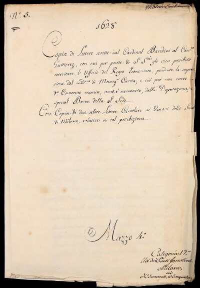 Sei in Strumenti di ricerca: Sezione Corte | Materie ecclesiastiche per categorie [Inventario n. 79.2] | Categoria 17. Usi dei Paesi Forestieri | Milano Regio Economato ed Exequatur | Fascicolo 5