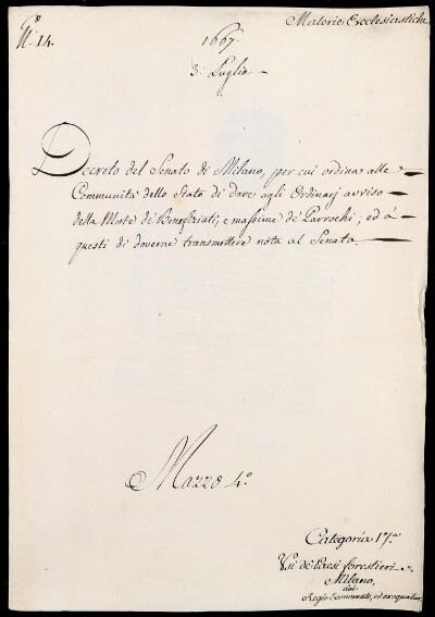 Sei in Strumenti di ricerca: Sezione Corte | Materie ecclesiastiche per categorie [Inventario n. 79.2] | Categoria 17. Usi dei Paesi Forestieri | Milano Regio Economato ed Exequatur | Fascicolo 14
