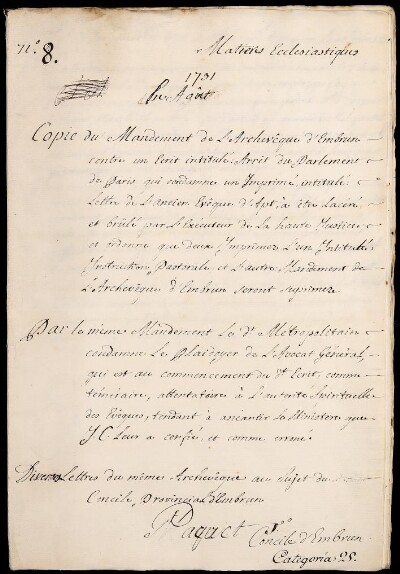 Mandamento dell'Arcivescovo d'Embrun contro uno scritto intitolato "Arrêt du Parlement de Paris, qui condamne un imprimé intitulé... Lettre de l'ancien Evêque d'Apt à être lacéré, et brûlé par l'éxécuteur de la haute Iustice" nel quale s'ordina, che due copie stampate, l'una intitolata Instruction Pastorale, e l'altra Mandement de l'Archevêque d'Embrun saranno soppresse.