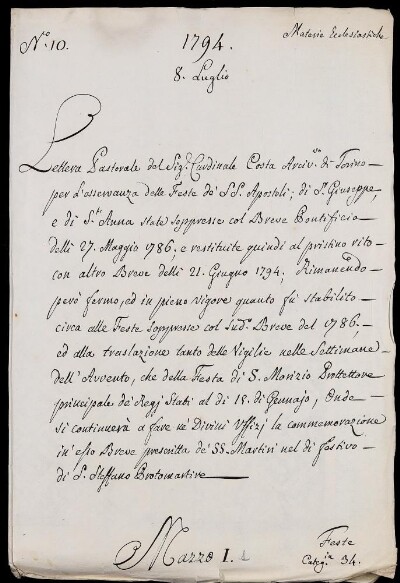 Lettera Pastorale del Sig.r Cardinale Costa Arciv.o di Torino per l'osservanza delle feste de' SS. Apostoli, di S. Giuseppe, e di S. Anna state soppresso col breve Pontificio delli 27. mag.o 1786., e restituito quindi al pristino rito con altro breve delli 21. giugno 1794., rimanendo però fermo, ed in pieno vigore quanto fu stabilito circa le feste soppresse col suddetto breve del 1786., e la traslaz.e sì delle vigilie nelle settimane dell'Avvento, che della festa di S. Morizio protettore principale de' Regj Stati al dì 15. di gennajo, onde si continuerà a fare ne' Divini Uffizj la commemorazione in esso breve prescritta de' SS. Martiri nel dì festivo di S. Steffano protomartire. 8. luglio 1794.