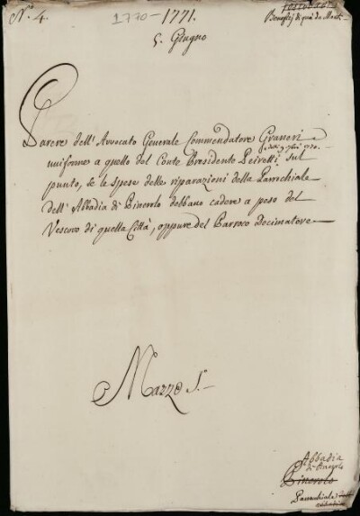 Sei in Strumenti di ricerca: Sezione Corte | Benefizi di qua dai monti in Materie ecclesiastiche [Inventario n. 81.1] | Benefizi di qua dai Monti | Mazzo 1 | Fascicolo 4. Abbadia di Pinerolo. Parrochiale di S. Verano