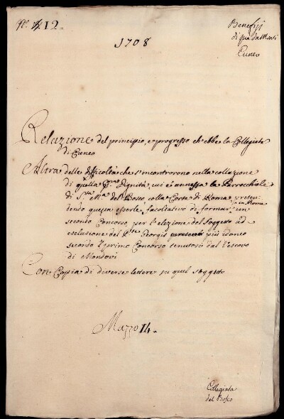 Sei in Strumenti di ricerca: Sezione Corte | Benefizi di qua dai monti in Materie ecclesiastiche [Inventario n. 81.1] | Benefizi di qua dai Monti | Mazzo 14 | Fascicolo 12. Cuneo Collegiata