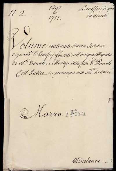 Volume contenente diverse Scritture riguardanti li Benefizj semplici fondati nelle Collegiate de' Santi Donato, e Morizio della Città di Pinerolo 1497. in 1771.