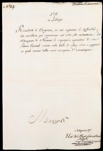 Sei in Strumenti di ricerca: Sezione Corte | Materie ecclesiastiche per categorie [Inventario n. 79.2] | Categoria 17. Usi dei Paesi Forestieri | Milano Regio Economato ed Exequatur | Fascicolo 29