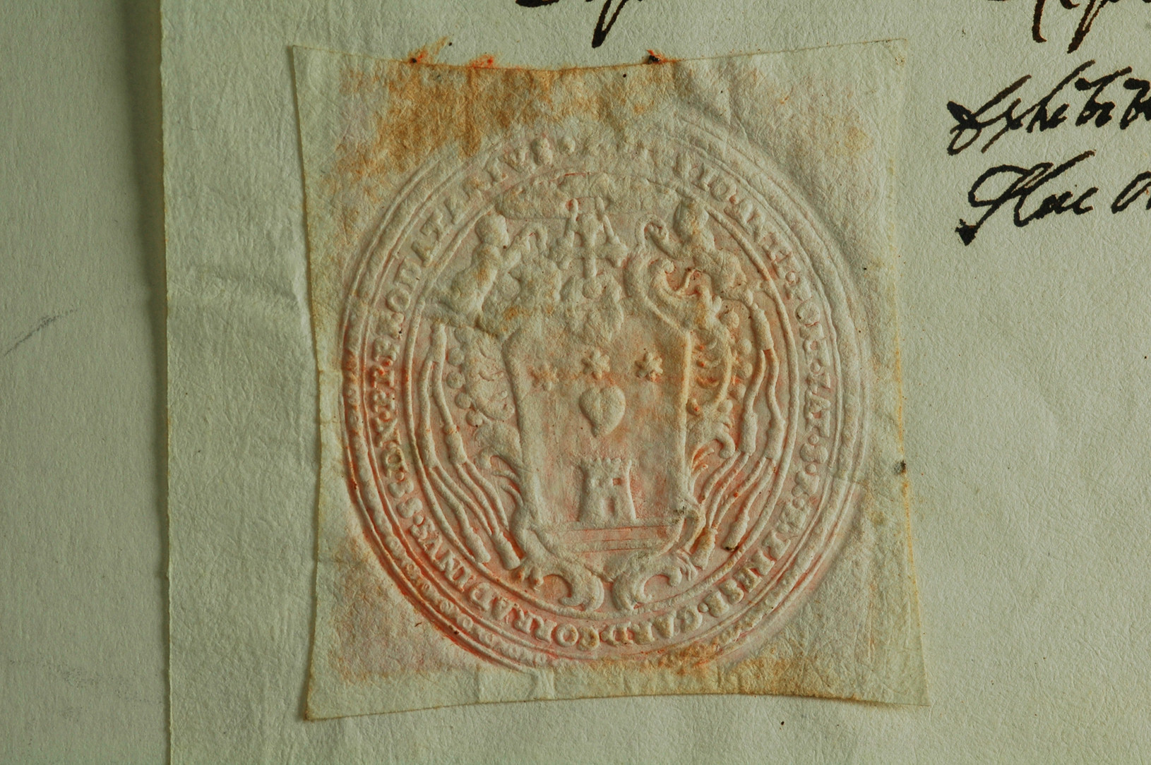 Targa barocca carica di uno scudo sagomato, alla torre merlata di cinque pezzi, aperta e finestrata, fondata su una pianura troncata; sormontata da un cuore, accompagnato in capo da tre stelle di sei raggi poste in fascia; caricato nel punto del capo di uno scudetto troncato, al 1° alla rosa, al 2° al monte di tre cime all'italiana, con una fascia in divisa attraversante sulla partizione. Lo scudo è accollato alla croce astile e timbrato da un cappello prelatizio a tre ordini di nappe tenuto da due putti