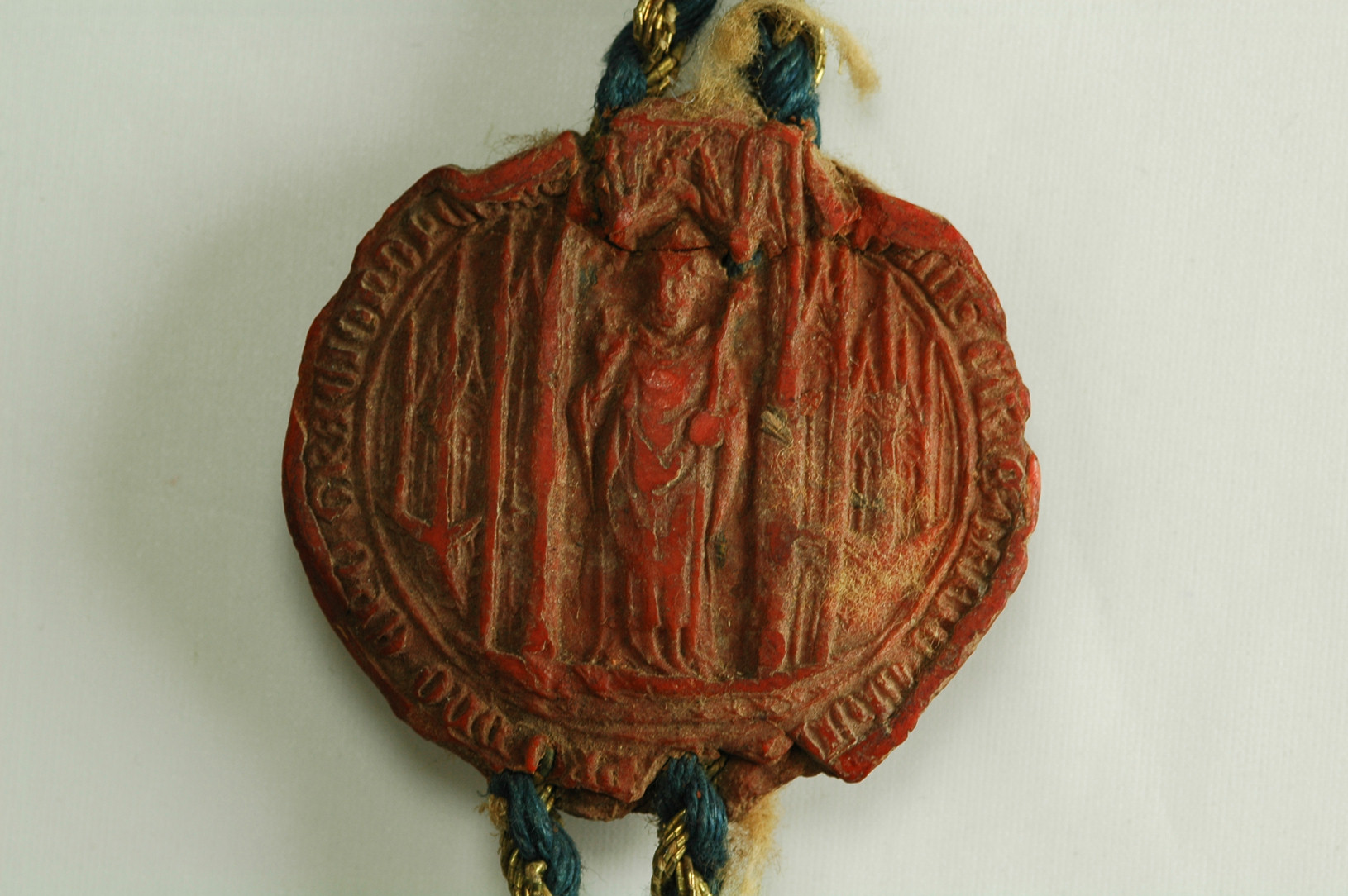 Vescovo mitrato benedicente con la destra e tenente il pastorale con la sinistra; la figura è posta entro un'edicola architettonica affiancata da colonnine e archetti. La parte superiore dell'edicola interrompe la legenda