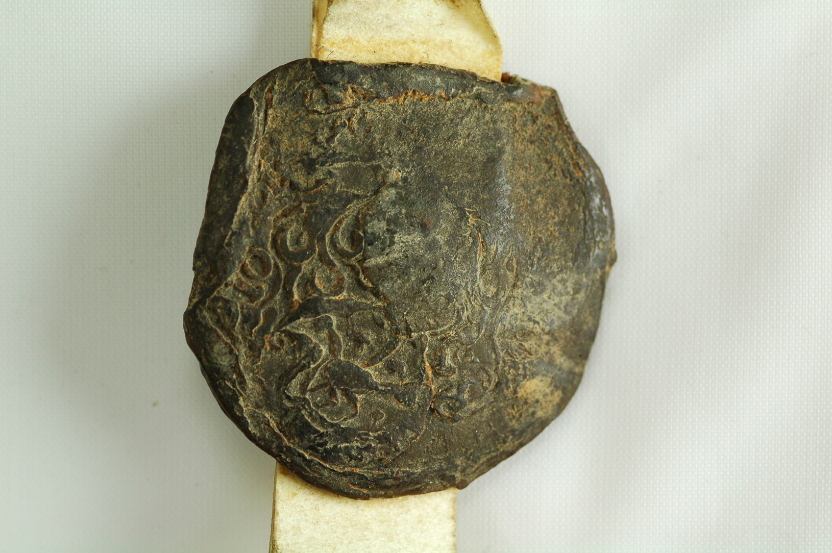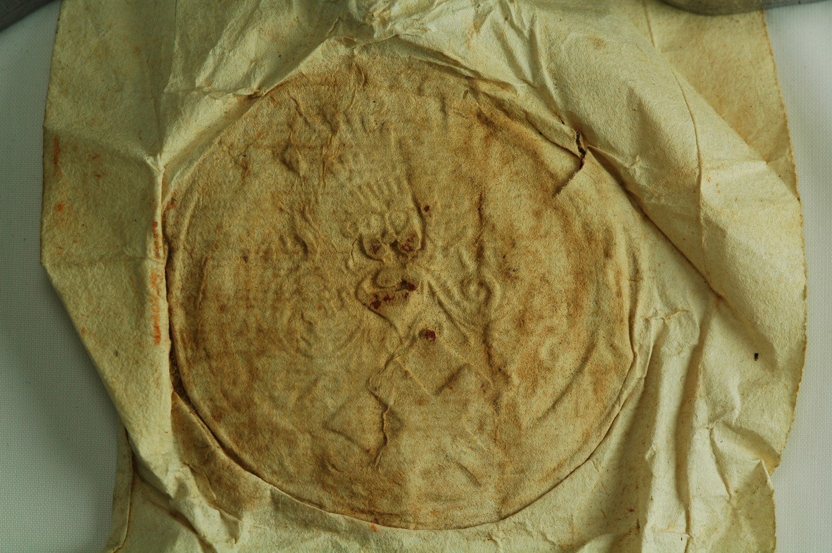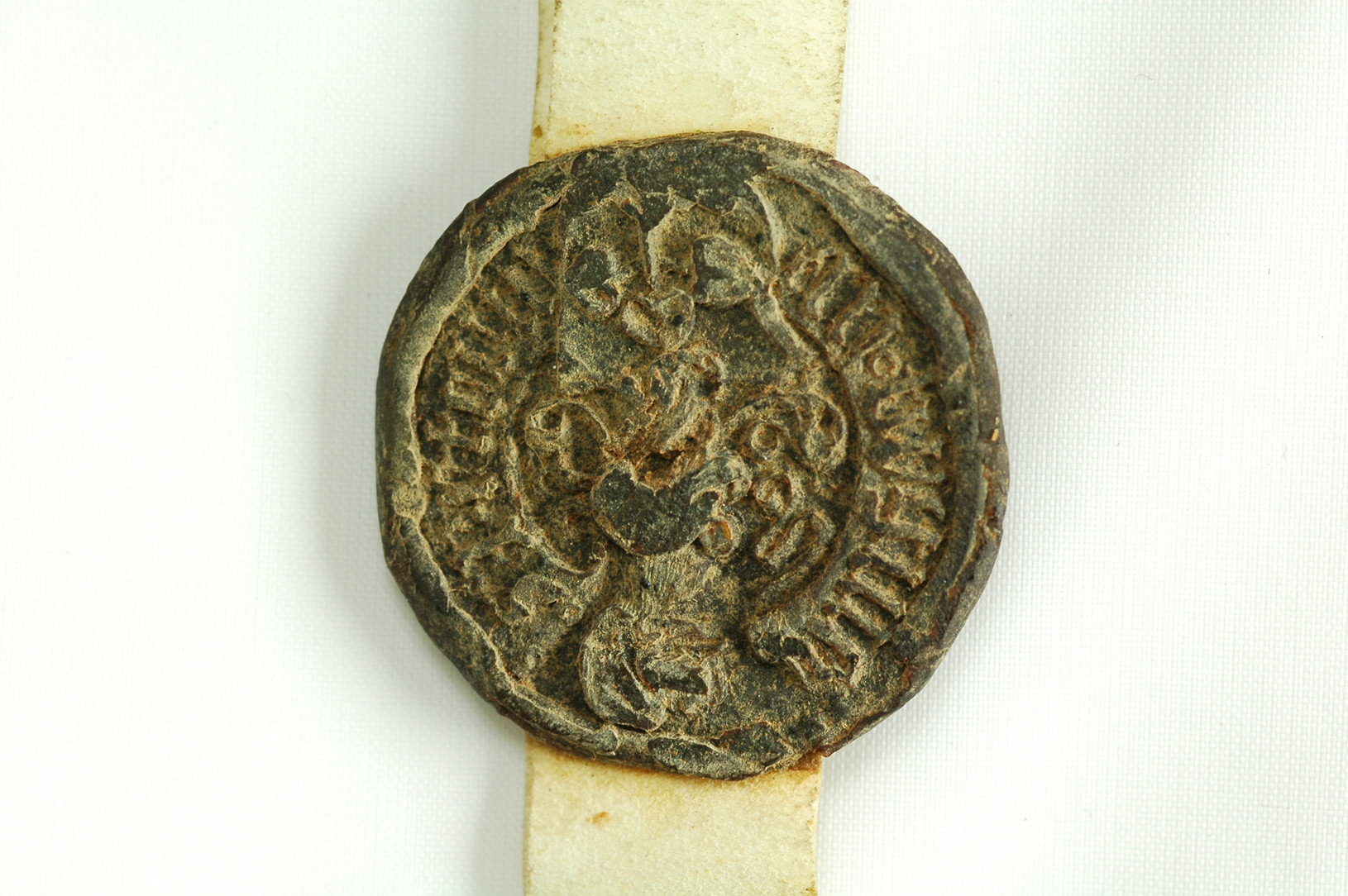 Impronta malamente leggibile. Si distingue uno scudo inclinato alla croce, timbrato da elmo [a becco di passero] ornato di lambrecchini, cimato da un ceffo di leone alato [e affiancato dalle lettere FE e RT]. Il cimiero interrompe la legenda che corre su di un cartiglio aperto in basso