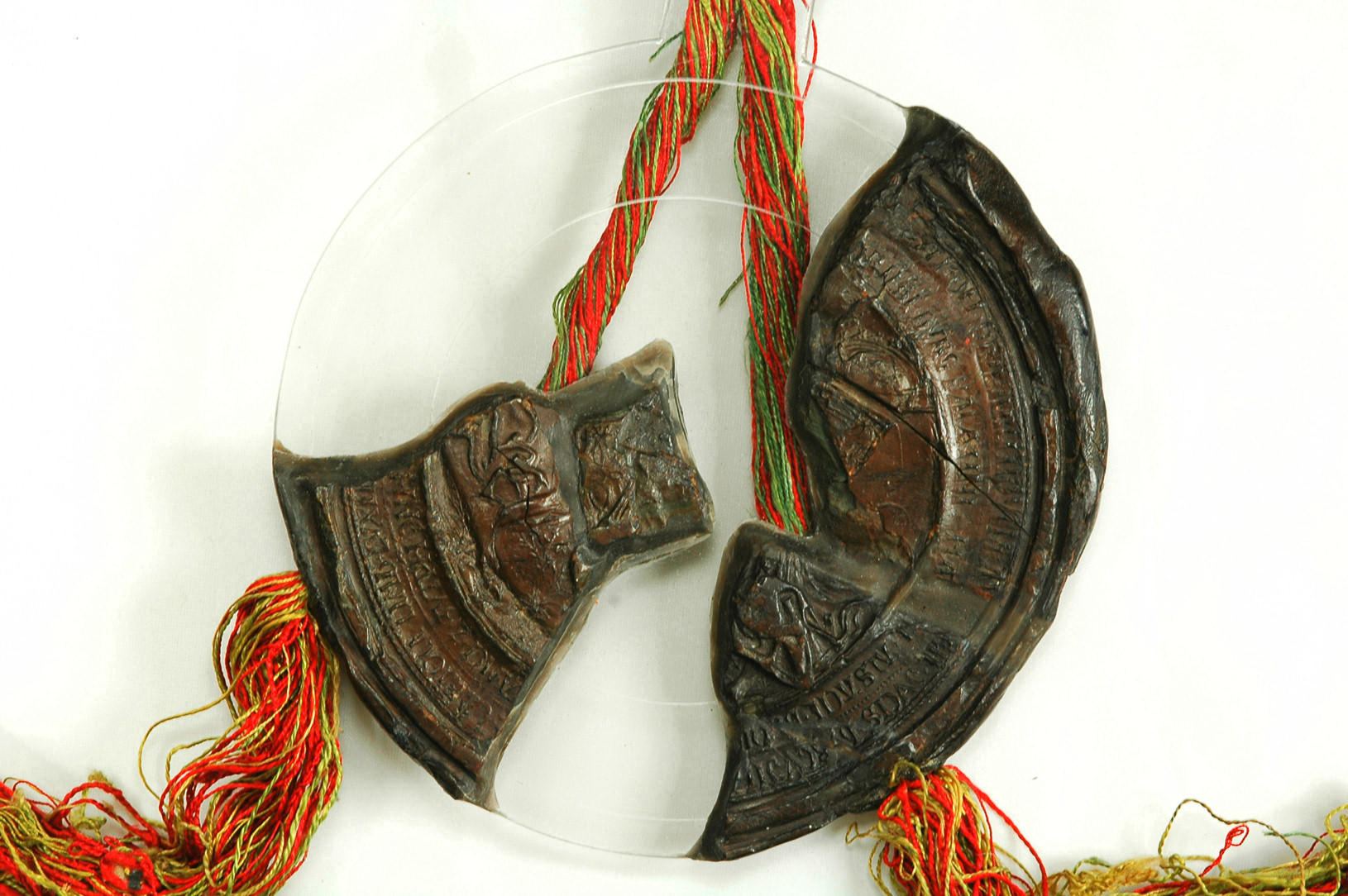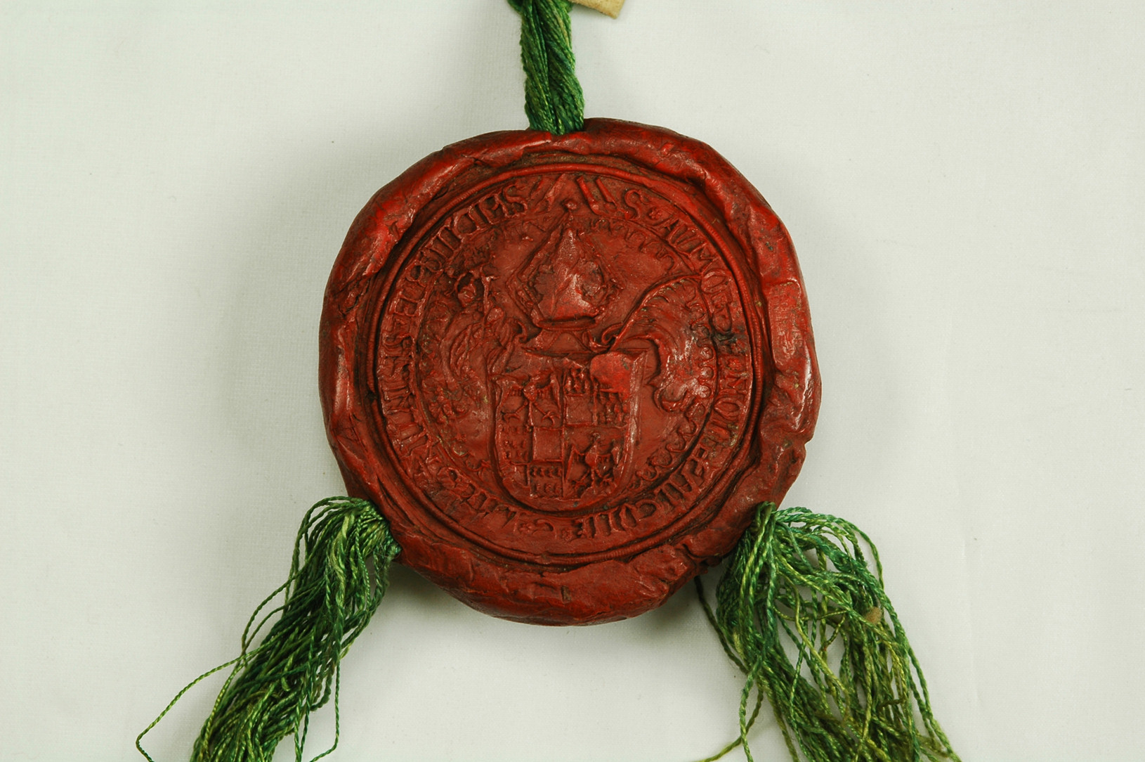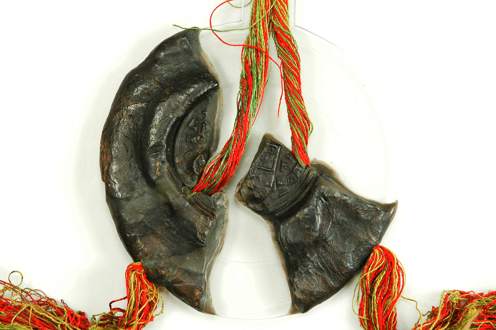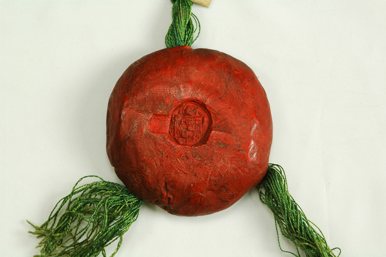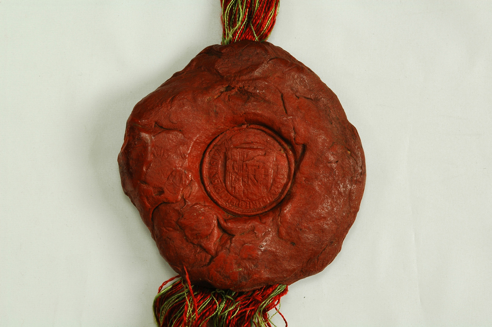 Impronta frammentaria. Si conserva parte di uno scudo inquartato (rimane visibile il secondo quarto di Borgogna moderna) e, sulla destra, un cartiglio con un motto di cui rimangono le due lettere finali UM