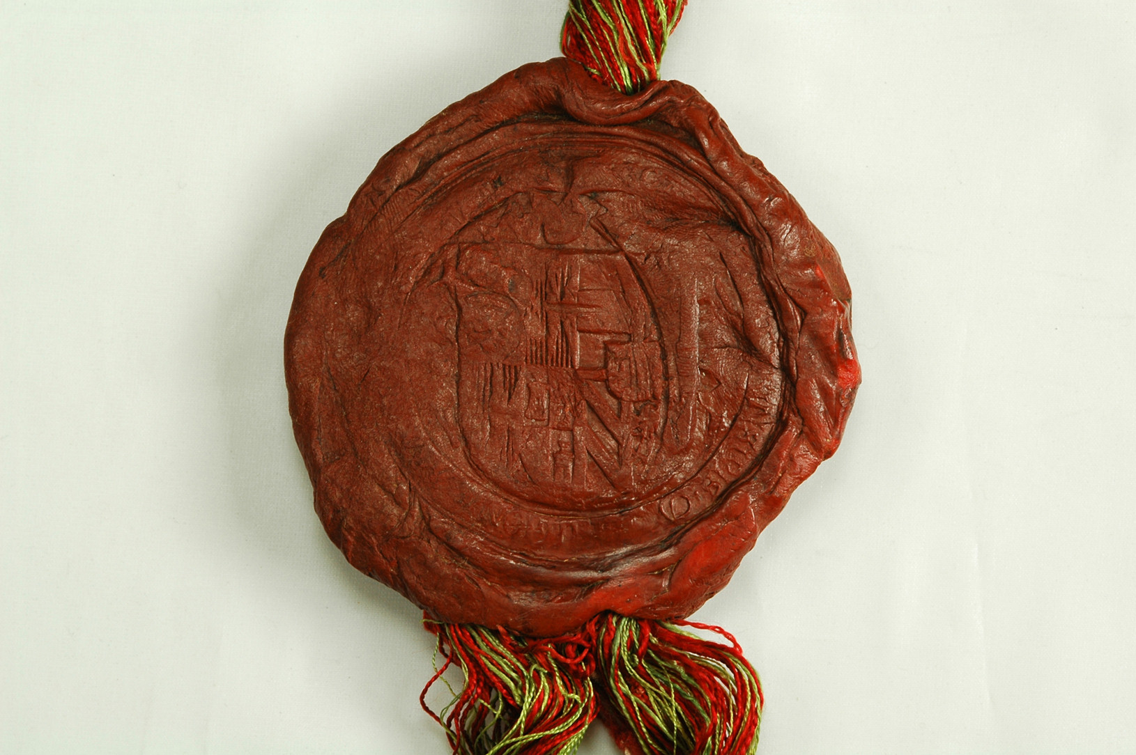 Scudo arrotondato partito, al 1° inquartato, a) e d) controinquartato di Castiglia e Léon, b) e c) partito di Aragona e Sicilia; al 2° inquartato, a) d'Austria, b) [di Borgogna moderna], c) di Borgogna antica, d) [di Brabante], caricato sul tutto di uno scudetto illeggibile. La legenda corre su un cartiglio